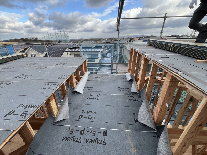 上棟後、真っ先に行うのが屋根の防水処理です。