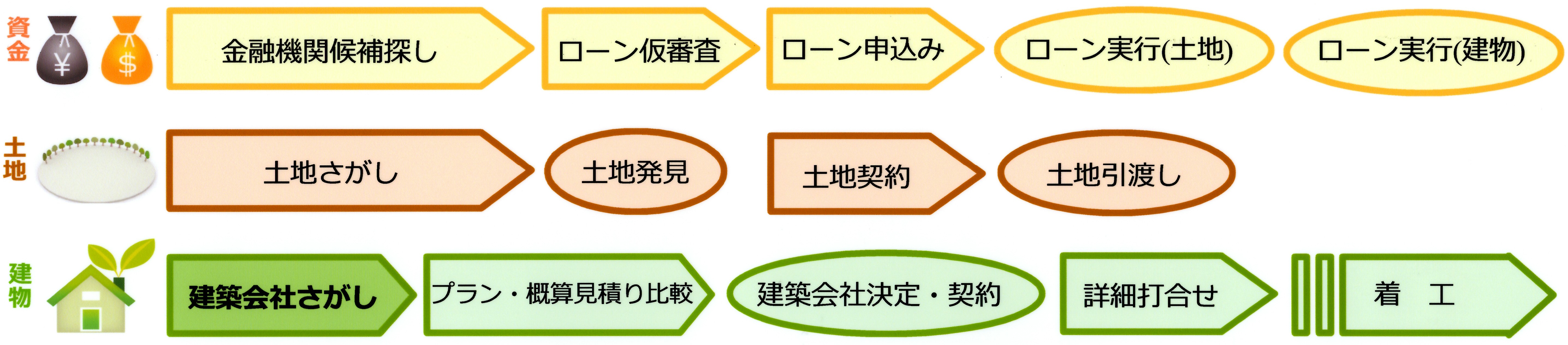 上図のように〈資金〉〈土地〉〈建物〉を平行して進めていくとスムーズです。