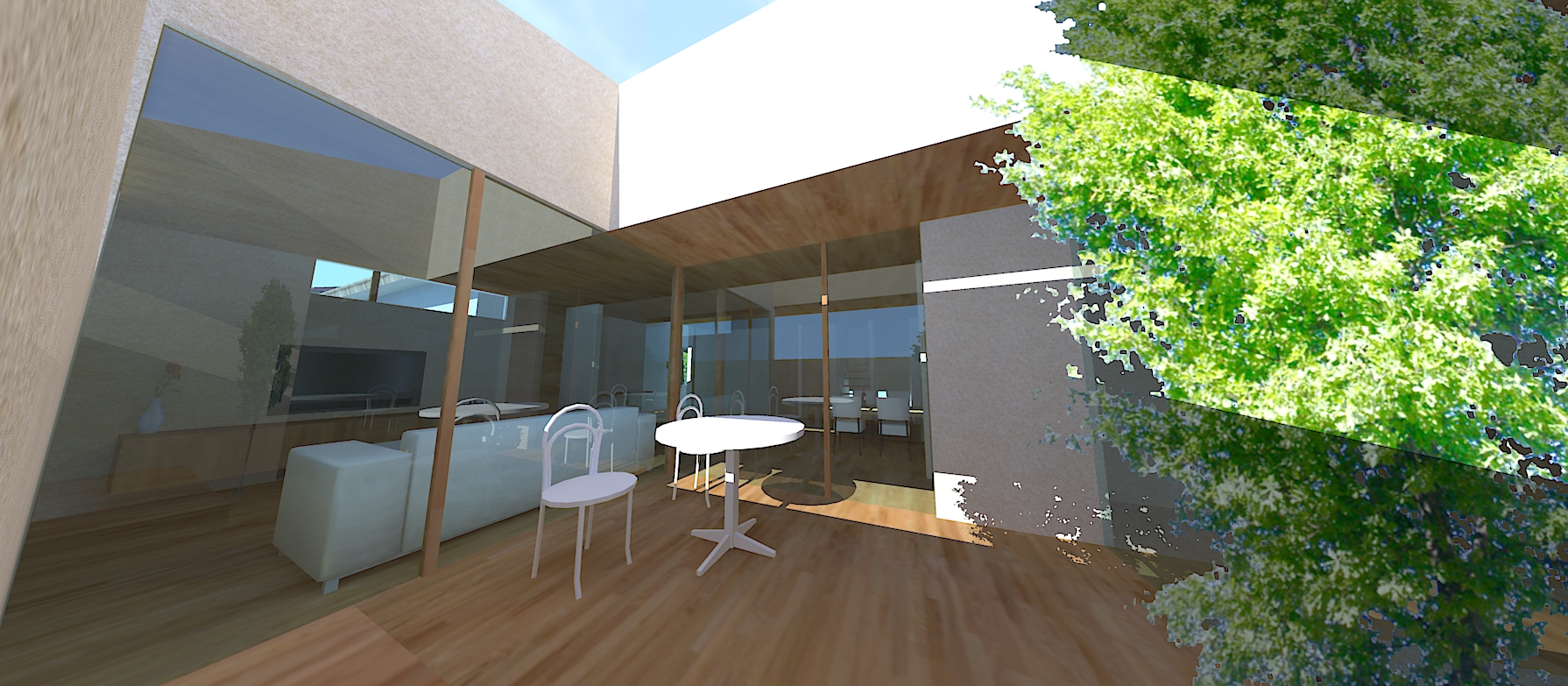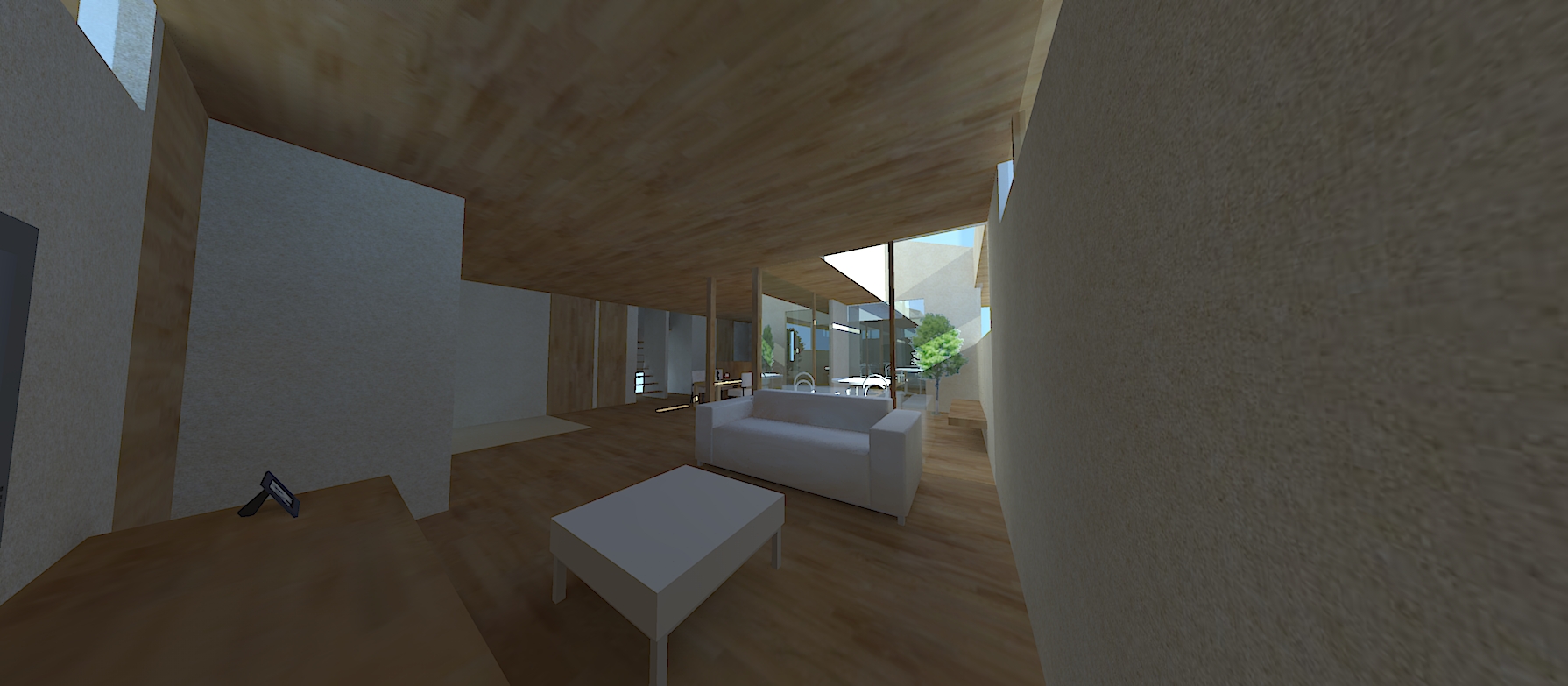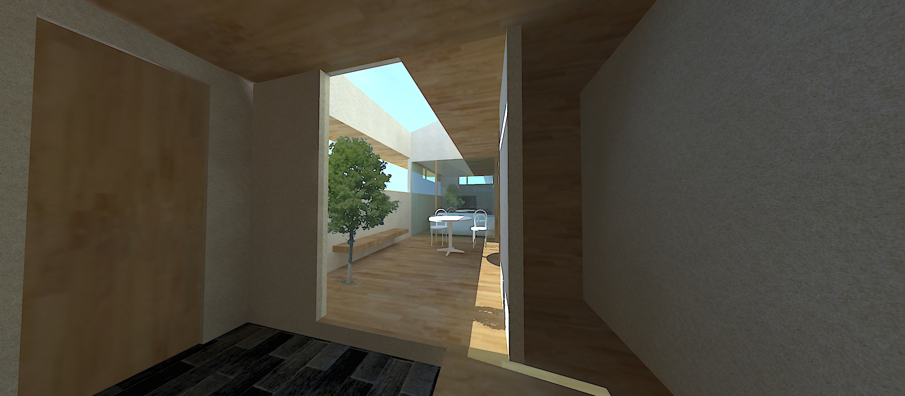 大谷石が敷かれた玄関から中庭の広がりを感じ、チェリー材による玄関収納、無垢のフローリング、珪藻土の壁、板張り天井など、自然素材に囲まれた玄関・リビング空間。 異なる雰囲気の2つの中庭空間が楽しめ、家族の笑顔が絶えず、楽しく、落ち着いた時間を過ごせるリビング空間となりました。