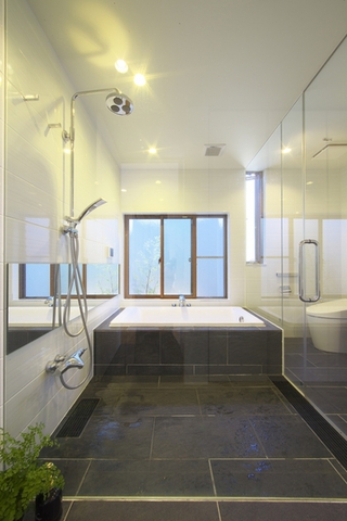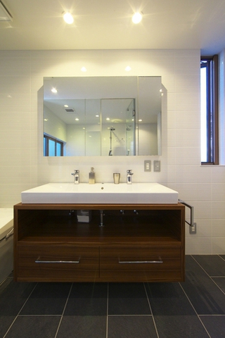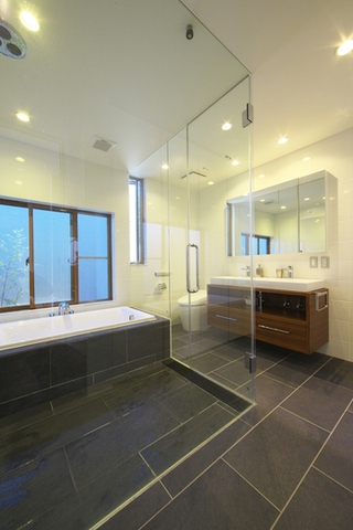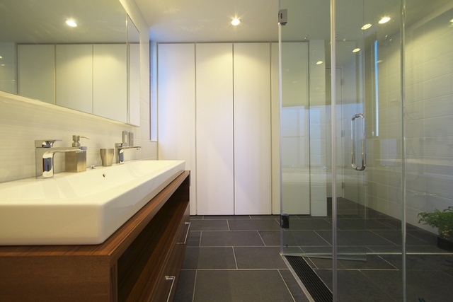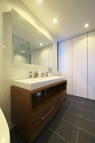 打って変わって、水廻り空間は、ガラス間仕切り、スタイリッシュな洗面台などにより、ホテルライクなインテリアとなっています。