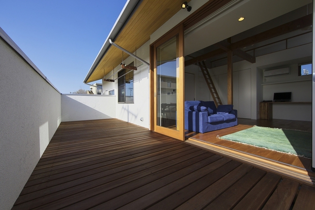 リビングと連続する大きなウッドデッキも心地いい空間になっています。